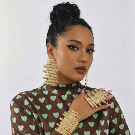 This statement trio—dramatic drop earrings, a wide cuff bracelet, and a bold statement ring, creates an unapologetic, head-turning look that elevates even the simplest ensemble. Designed to be worn together or styled individually, each piece delivers maximum impact with effortless sophistication.